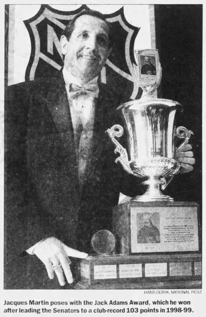 The team kept rising from there. The Sens won their first playoff series the next season, followed by their first division title in 1998-99. After that 103-point season, Martin earned the Jack Adams Award as the NHL’s top coach. He was also a finalist for the honour in 2003, 2001 and 1997.