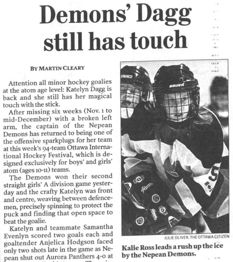 Katelyn Dagg was among the hometown heroes in the first tournament as she returned from a broken arm earlier in the season in time to provide an offensive spark for her Nepean Demons in their run to the girls’ A championship game, although the Cornwall Typhoons ultimately won that division.