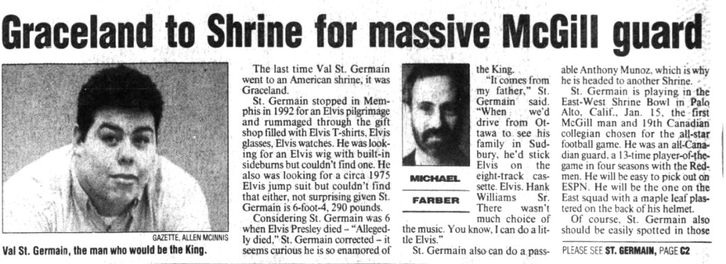 St. Germain made a second trip down south in 1994, this time for the East-West Shrine Bowl in Palo Alto, California. He was one of two Canadians invited to the event that served primarily to showcase NCAA seniors. The prospect of an NFL contract was more than a little enticing, but St. Germain maintained he was happy to remain in Canada.
